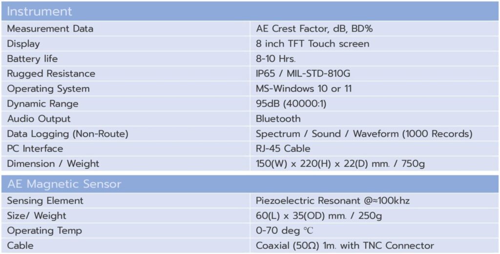 - บอกค่าความเสียหาย (AE Crest Factor) และ เสียง (dB) เป็นตัวเลข